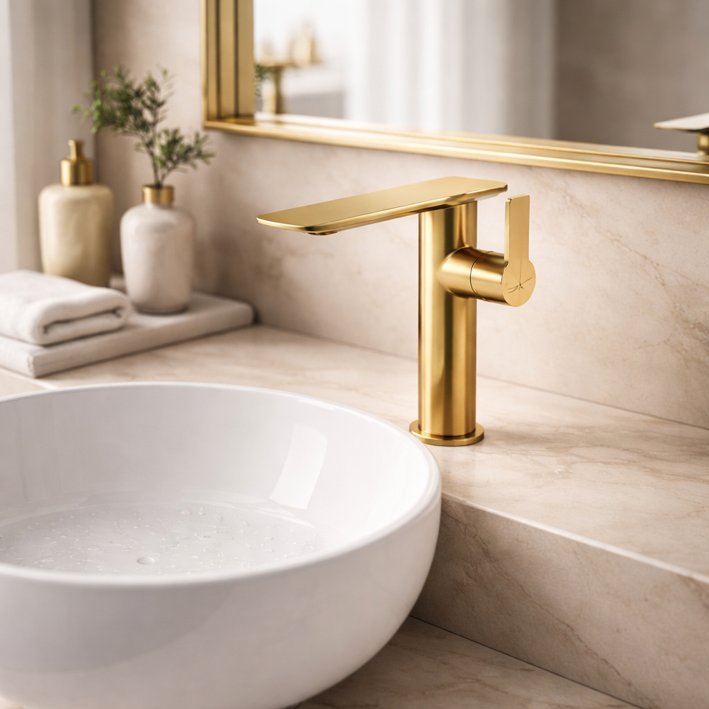 Upgrade your bathroom with the premium Basin Mixer in Brushed gold. This luxury Basin Mixer is designed for modern bathrooms, combining German engineering, durability, and modern design — perfect for high-end spaces.