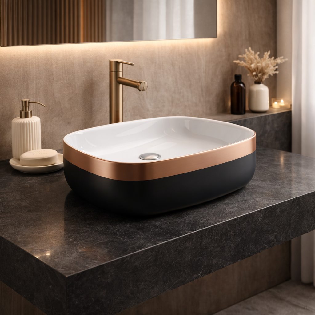 Upgrade your bathroom with the premium Wash basin in Black Rose Gold. This luxury Counter top WashBasin is designed for modern bathrooms, combining German engineering, durability, and modern design — perfect for high-end spaces.